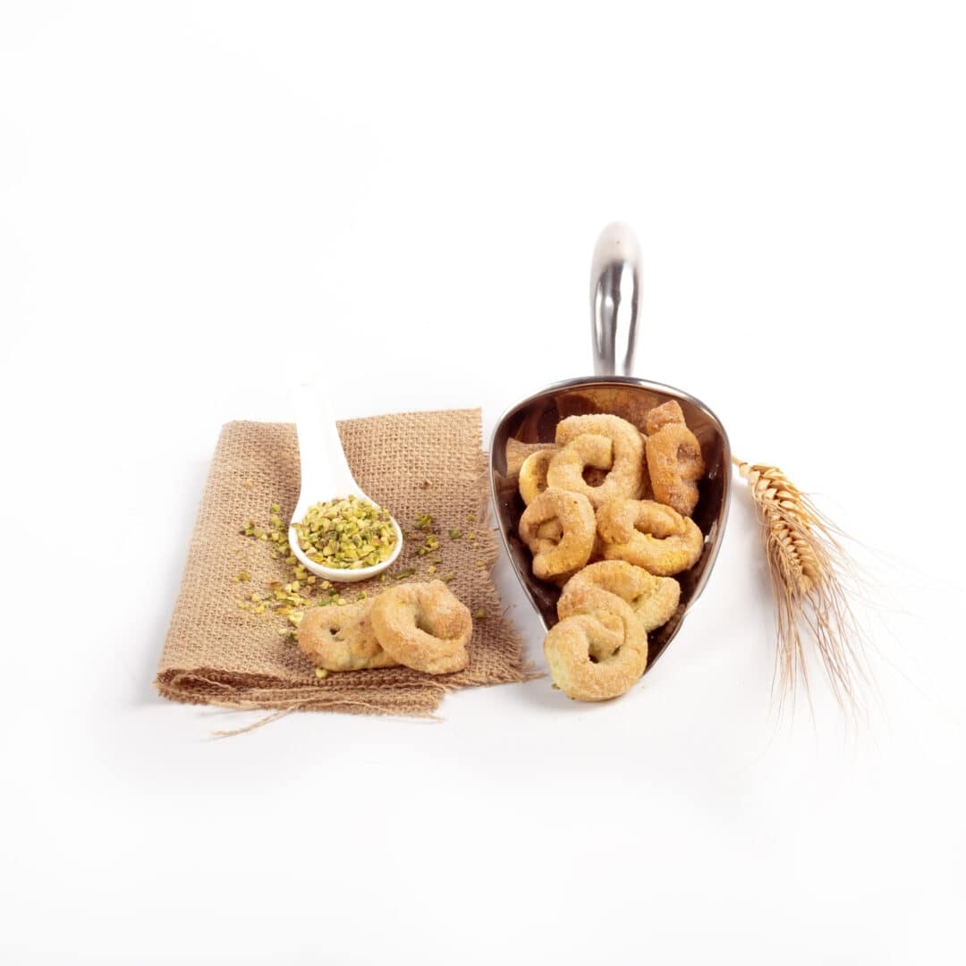 Farina di grano tenero, olio di oliva, acqua, zucchero, margarina vegetale (grassi e oli vegetali (palma, cocco, colza e girasole), grasso vegetale totalmente idrogenato, burro anidro, emulsionanti (E322, E471, E472c, E475, E476), conservante E202, sale, aroma, regolatori di acidità (E330, E331), colorante E160a, pasta pistacchio 8% (olio vegetale, pistacchi, mandorle, lattosio e proteine del latte, destrosio, glucosio disidratato, aroma, emulsionante: lecitina di soia, coloranti: curcumina, clorofilla), pistacchio 2%, sale, polvere lievitante, vanillina.