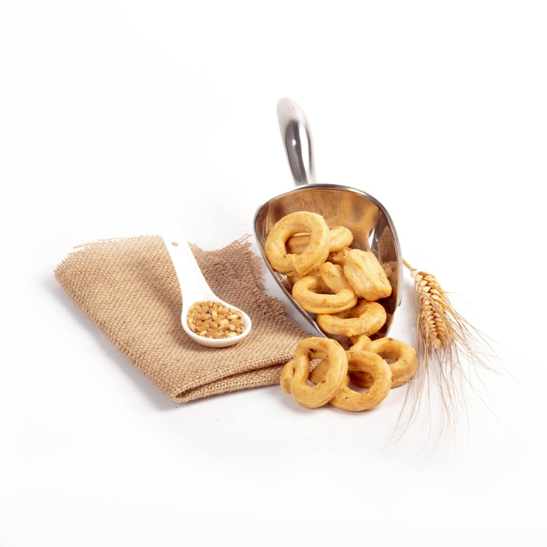 Ingredienti: Farina di FRUMENTO, acqua, vino bianco, olio di oliva, olio extravergine di oliva, semi di finocchio, sale.