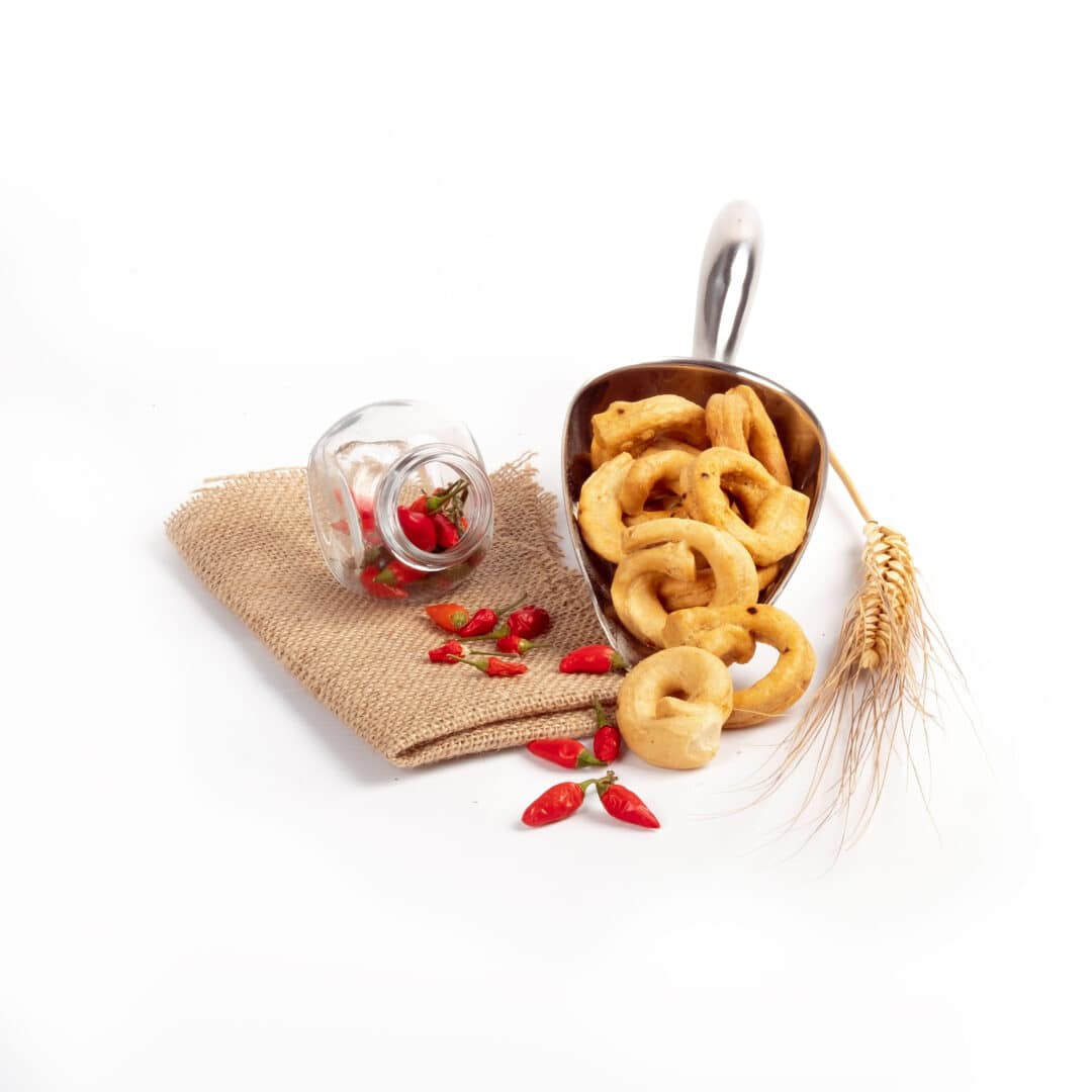 Ingredienti: Farina di FRUMENTO, acqua, VINO bianco, olio di oliva, olio extravergine di oliva, peperoncino macinato, sale.